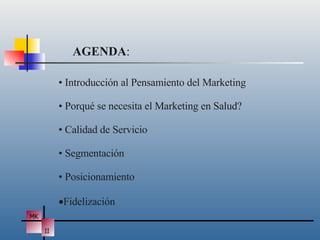 Este documento presenta estrategias de marketing para servicios de salud. Explica que el marketing es necesario en este sector debido al aumento de ofertas, clientes más informados y exigentes, y tecnologías cambiantes. También discute desafíos como la complejidad de las relaciones, la importancia de la experiencia, y la dificultad de diferenciación. Además, cubre temas como calidad de servicio, segmentación, posicionamiento y fidelización.