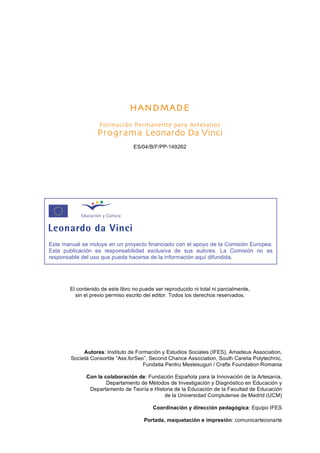 Este documento presenta un manual sobre marketing y publicidad para artesanos. Explica conceptos básicos de marketing como identificar las necesidades de los clientes, desarrollar productos valiosos y distribuirlos de manera efectiva. Además, describe herramientas como el análisis DAFO, PEST y de las cinco fuerzas para evaluar el entorno interno y externo de una organización y desarrollar estrategias de marketing. El manual contiene módulos sobre introducción al marketing, análisis del marketing, logística, canales de distrib