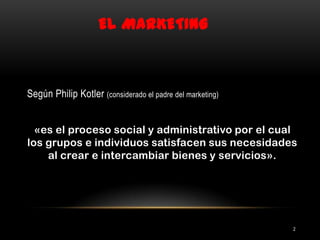 El documento resume los conceptos clave del marketing. Define el marketing como el proceso social y administrativo mediante el cual los grupos e individuos satisfacen sus necesidades creando e intercambiando bienes y servicios. Explica las 4P del marketing: producto, precio, plaza y promoción. Cada P representa un elemento clave que las empresas deben considerar para lograr el máximo beneficio en la venta de sus productos.
