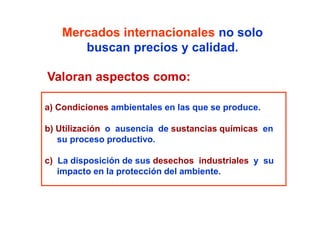 El documento habla sobre la importancia que los mercados internacionales le dan no solo al precio y la calidad de los productos, sino también a las condiciones ambientales de producción, el uso de sustancias químicas y la disposición de desechos industriales. Valoran aspectos relacionados con el impacto ambiental.