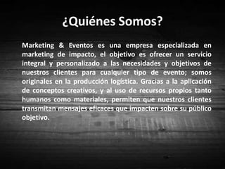 Marketing y Eventos es una empresa colombiana especializada en la organización y ejecución de eventos. Su visión es convertirse en los líderes del mercado en 5 años gracias a su transparencia, eficiencia y calidad. Para atraer clientes utilizan publicidad, folletos, página web y redes sociales. Ofrecen un servicio personalizado, alta calidad y postventa para retenerlos.
