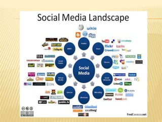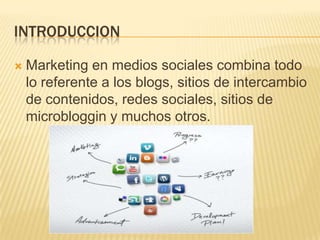 Este documento habla sobre el marketing en las redes sociales. Explica que el marketing en medios sociales incluye blogs, redes sociales y otras plataformas. También cubre la gestión de reputación y la influencia positiva. Luego discute cómo las bibliotecas usan herramientas como blogs, Facebook, Twitter y otras redes para promover sus servicios y actualizar a los usuarios. Finalmente, enfatiza la importancia de tener un plan de marketing que incorpore estas estrategias en línea.