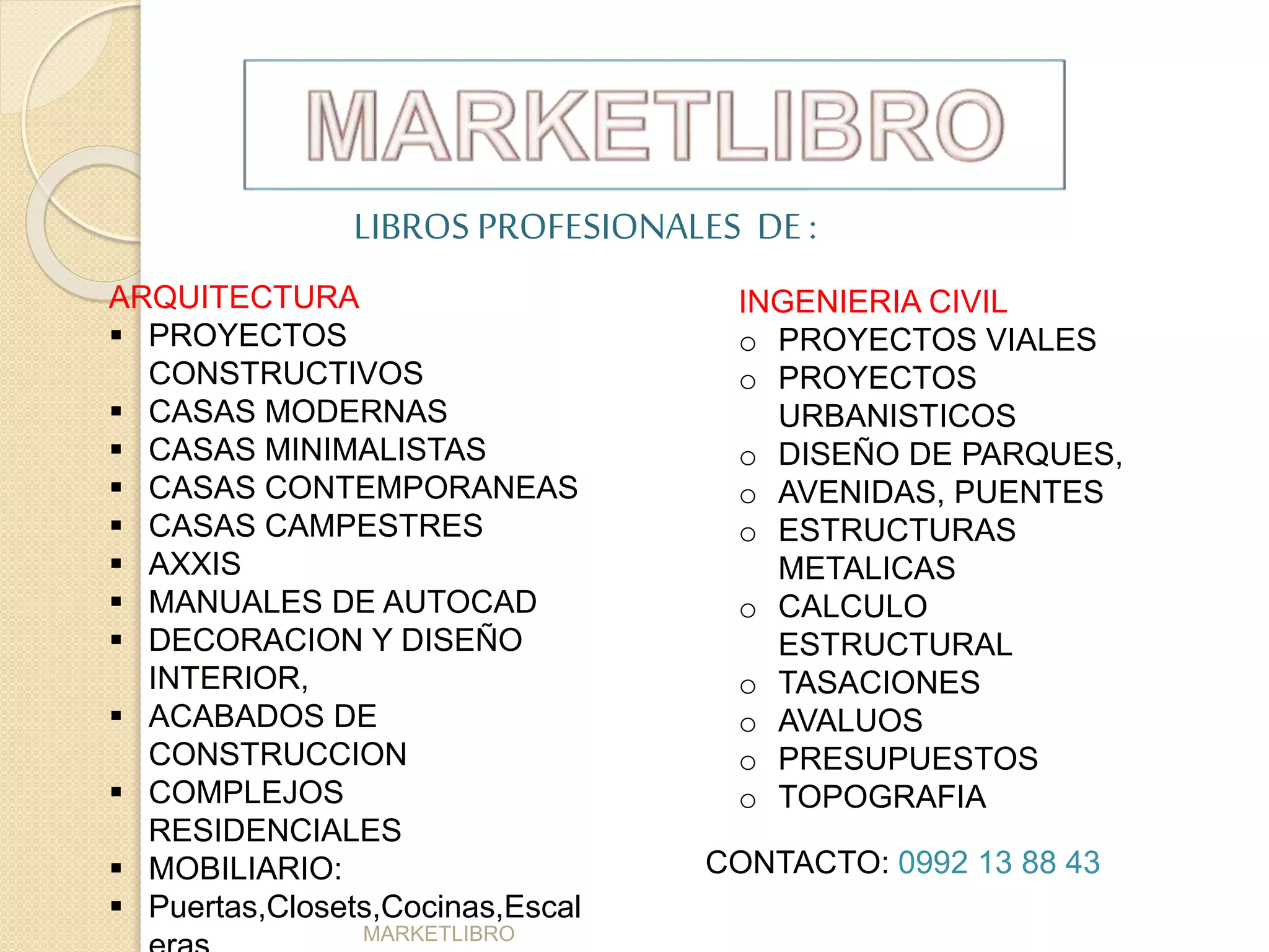 El documento presenta una lista de libros profesionales de arquitectura y construcción ofrecidos por Marketlibro, incluyendo libros sobre proyectos constructivos, casas modernas, diseño interior, paisajismo, ingeniería civil, materiales de construcción y más. Proporciona información de contacto para Marketlibro.