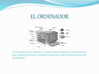 El documento describe los componentes básicos de un ordenador, incluyendo el hardware (partes físicas como la pantalla y el teclado) y el software (programas como Word y Excel). Explica que el software se divide en dos categorías: sistema, que gestiona los recursos del ordenador, e aplicaciones, que son programas diseñados para tareas específicas.