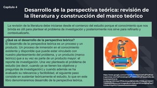 Este documento describe el proceso de desarrollo de la perspectiva teórica para una investigación. Explica que este proceso implica revisar la literatura existente sobre el tema y construir un marco teórico. La revisión de literatura comprende identificar fuentes primarias relevantes, localizarlas y extraer información clave de ellas. Luego, el marco teórico se construye integrando los conceptos y relaciones encontrados en la literatura para contextualizar el problema de investigación.