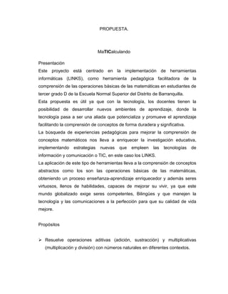 Este documento presenta una propuesta para implementar herramientas informáticas como LINKS para facilitar la comprensión de las operaciones matemáticas básicas en estudiantes de tercer grado. El objetivo es mejorar el aprendizaje mediante el uso de la tecnología de una manera significativa y duradera. La propuesta busca que los estudiantes resuelvan problemas aditivos y multiplicativos utilizando diferentes estrategias de cálculo como la estimación.