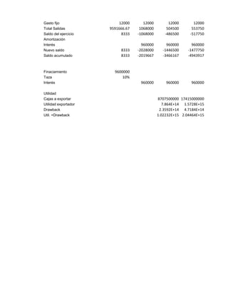 El documento presenta un análisis financiero de 10 años para un proyecto agrícola. Detalla los costos de producción, ventas proyectadas, flujos de efectivo e ingresos netos anuales. Muestra que el proyecto genera pérdidas los primeros años pero comienza a ser rentable a partir del año 10, con utilidades crecientes proyectadas hasta el año 20.