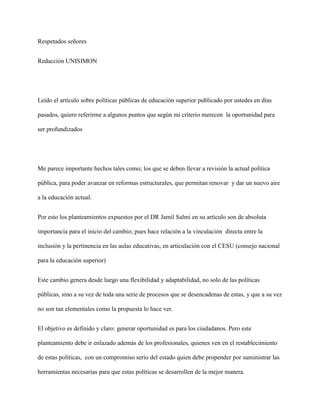 El documento presenta dos cartas que discuten temas relacionados con políticas públicas de educación superior y ciencia, tecnología y medio ambiente. La primera carta argumenta que la política pública actual de educación superior requiere reformas estructurales para mejorar la inclusión y pertinencia, mientras que la segunda analiza cómo la participación ciudadana, percepción social y regulación pública influyen en el diseño de políticas sobre ciencia y tecnología.