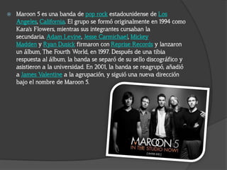 Maroon 5 se formó originalmente en 1994 como Kara's Flowers en Los Ángeles. La banda tuvo éxito con su álbum debut Songs About Jane en 2002 y ha vendido más de 10 millones de álbumes en EE.UU. Sus sencillos más exitosos incluyen "Moves Like Jagger", "Payphone", y "One More Night".