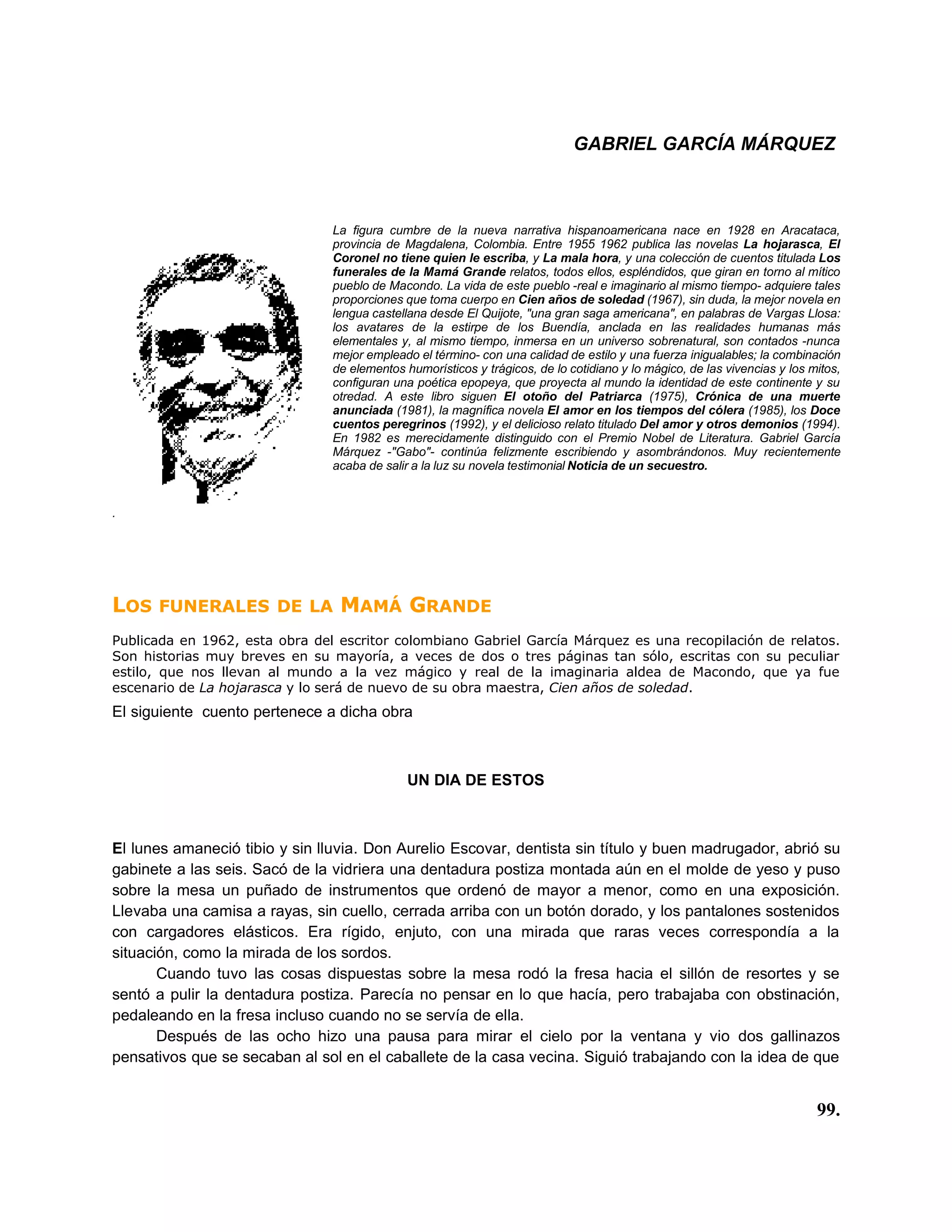 Este documento presenta una breve biografía del escritor colombiano Gabriel García Márquez. Destaca que nació en 1928 en Colombia y publicó varias novelas y cuentos entre 1955 y 1962 que giran en torno al pueblo de Macondo. Su obra más famosa es Cien años de soledad de 1967, considerada una de las mejores novelas en español desde El Quijote. García Márquez continuó publicando exitosas obras y recibió el Premio Nobel de Literatura en 1982.