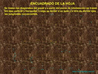 El documento describe cómo trazar las líneas de un cuadriculado en una hoja de papel. Se trazan primero las diagonales para encontrar el punto de intersección y luego los ejes vertical y horizontal. A partir de ahí, se toman las longitudes convenientes a ambos lados de los ejes para completar el cuadriculado. El documento también incluye información sobre un estudiante, profesor e institución educativa.
