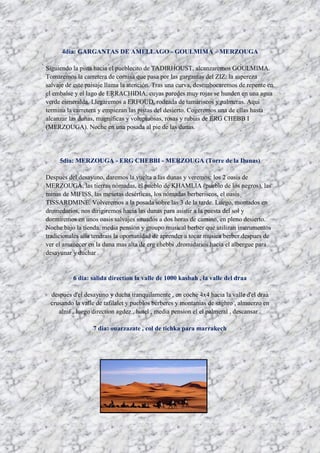 El documento describe un itinerario de 6 días en Marruecos que incluye visitas a cascadas, pueblos berberes, desiertos de dunas y oasis. El viaje comienza en Marrakech y luego visita Ouzoud, El Ksiba, Imilchil, las gargantas de Amellago, Merzouga y sus dunas de arena, antes de dirigirse al valle del Draa y regresar a Marrakech a través del paso de Tichka.