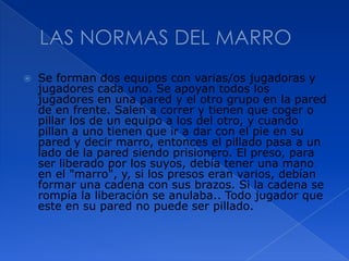 Este documento describe las reglas de un juego de captura entre dos equipos. Los jugadores de cada equipo se apoyan en paredes opuestas y tratan de atrapar a los del equipo contrario, diciendo "marro" cuando lo logran. Los atrapados se convierten en prisioneros y deben formar una cadena para ser liberados por su equipo. El juego termina cuando un equipo logra atrapar el pañuelo del otro antes de que lo devuelvan a su pared.