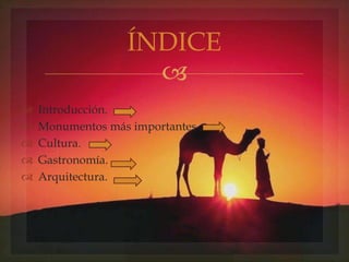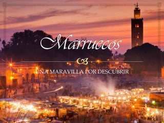 El documento describe Marruecos, destacando sus monumentos más importantes como la Menara de Marrakech y la Mezquita Hassan II de Casablanca, su cultura diversa y festivales de arte, su gastronomía que incluye platos como el cuscús, y su arquitectura histórica como el Palacio Real y la Kasbah des Oudaias.