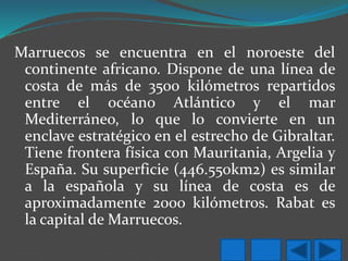 Marruecos se encuentra en el noroeste de África, con costas en el océano Atlántico y el mar Mediterráneo. Rabat es la capital y el país está dividido en 16 regiones, siendo la más poblada la región de Casablanca. Marruecos es una monarquía constitucional gobernada por un rey que nombra al primer ministro. La moneda es el dirham marroquí y el idioma oficial es el árabe aunque también se hablan el bereber, francés y español.