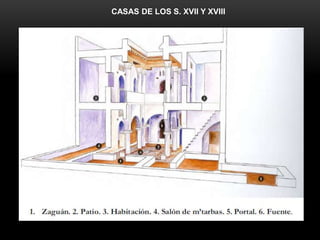 Este documento presenta información sobre la ciudad islámica y su arquetipo a través de la historia. Describe los elementos clave de la ciudad islámica como la mezquita, el mercado y los barrios residenciales. También discute conceptos como el fina', las calles, la colocación de puertas y ventanas, y la importancia de la privacidad y la intimidad en el diseño urbano de acuerdo a la ley islámica. Finalmente, ofrece detalles sobre la estructura de la casa islámica