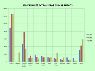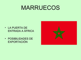 Este documento proporciona información sobre las ventajas de Marruecos como destino de exportación e inversión extranjera. Marruecos ofrece estabilidad política y económica, tasas de crecimiento notables, y una ubicación estratégica como puerta de entrada a África. El país también ha firmado varios acuerdos de libre comercio y tiene una legislación favorable para las inversiones extranjeras.
