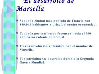 Marsella es la segunda ciudad más poblada de Francia, fundada por colonos focenses en el 600 a.C. como colonia comercial. Tras la revolución francesa adoptó su nombre actual. Ubicada en el sur de Francia, posee un clima mediterráneo cálido y cuenta con importantes monumentos históricos como la Basílica de Notre-Dame de la Garde y el Castillo de If, descrito en la novela El Conde de Montecristo.