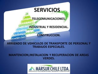 Este documento ofrece una lista de servicios de telecomunicaciones, construcción e industriales/residenciales. Incluye instalación y mantenimiento de sistemas de fibra óptica, cableado, redes inalámbricas, alarmas y más. También detalla servicios de construcción como levantamientos topográficos, presupuestos y supervisión de proyectos. Finalmente proporciona los detalles de contacto de la compañía Asesorías y Servicios Marsur Chile Limitada.