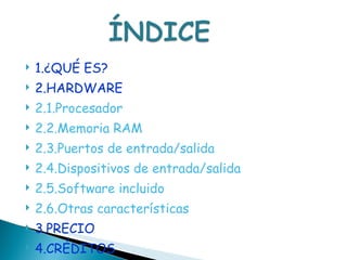 Este documento proporciona una descripción general de un ordenador portátil HP de 15,6 pulgadas, incluyendo sus especificaciones técnicas principales como el procesador Intel Core i3, 4 GB de RAM, una unidad óptica DVD y una pantalla LED de 1366 x 768, así como el software y accesorios incluidos. El precio total del ordenador y accesorios es de 699 euros.