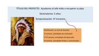 Este documento presenta un proyecto educativo sobre la cultura indígena apache y comanche para alumnos de 5 años de edad. El proyecto durará un mes y consistirá en actividades para que los alumnos aprendan sobre las costumbres indígenas y ayuden al jefe apache a recuperar su pipa de la paz robada por los comanches. El proyecto implicará a las familias y cubrirá objetivos curriculares relacionados con el autoconocimiento, el entorno natural, la cultura y la comunicación.