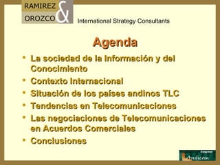El documento analiza el impacto del TLC entre Estados Unidos y los países andinos en la industria de las telecomunicaciones. Examina el contexto internacional de la sociedad de la información y las tendencias en telecomunicaciones. También cubre las negociaciones sobre telecomunicaciones en acuerdos comerciales y concluye resaltando la importancia de promover el acceso a las tecnologías de la información.
