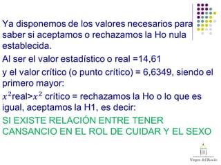 Una enfermera analiza los datos de 484 cuidadores familiares. Observa que 450 presentan cansancio en el rol de cuidador, de los cuales 168 son hombres y 282 mujeres. Utiliza la prueba de Chi cuadrado para determinar si existe una relación entre el sexo y presentar cansancio. Los resultados muestran que no hay una relación estadísticamente significativa entre ambas variables.