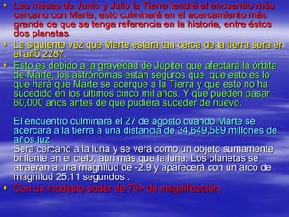 Marte se acercará más a la Tierra en agosto de 2022 que en los últimos 60,000 años, llegando a una distancia de solo 34 millones de kilómetros el 27 de agosto. Este acercamiento hará que Marte se vea más brillante que la Luna y pueda observarse a simple vista. El acercamiento de Marte a la Tierra se debe a la influencia gravitacional de Júpiter en las órbitas de los planetas y no volverá a ocurrir hasta el año 2287.