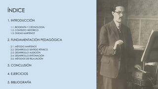 El documento describe el método educativo musical de Maurice Martenot. Martenot desarrolló un enfoque holístico que incluye el desarrollo del sentido rítmico, la atención auditiva, la entonación vocal y la relajación, con el objetivo de formar personas equilibradas a través de la música. Su método utiliza juegos e interacciones entre los estudiantes para enseñar estas habilidades de una manera práctica y divertida.