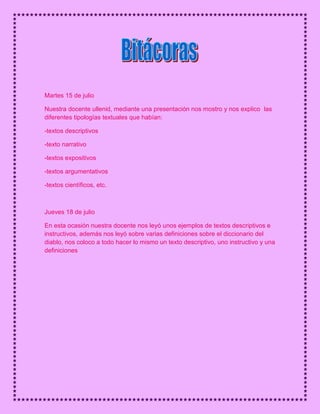 La docente presentó diferentes tipologías textuales como descriptivos, narrativos, expositivos, argumentativos y científicos. Luego leyó ejemplos de textos descriptivos e instructivos y definiciones del diccionario del diablo, y les pidió a los estudiantes que escribieran su propio texto descriptivo, instructivo y definición.