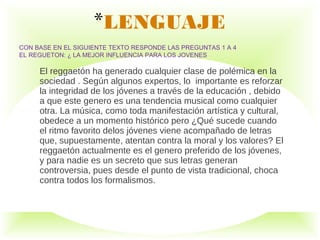 El documento habla sobre el reggaetón y su influencia en los jóvenes. Por un lado, algunos expertos dicen que las letras pueden influir en un comportamiento violento, pero otros dicen que escuchar música no representa un peligro. En general, existe un conflicto entre las normas de los adultos y jóvenes. El autor presenta diferentes puntos de vista de manera imparcial.