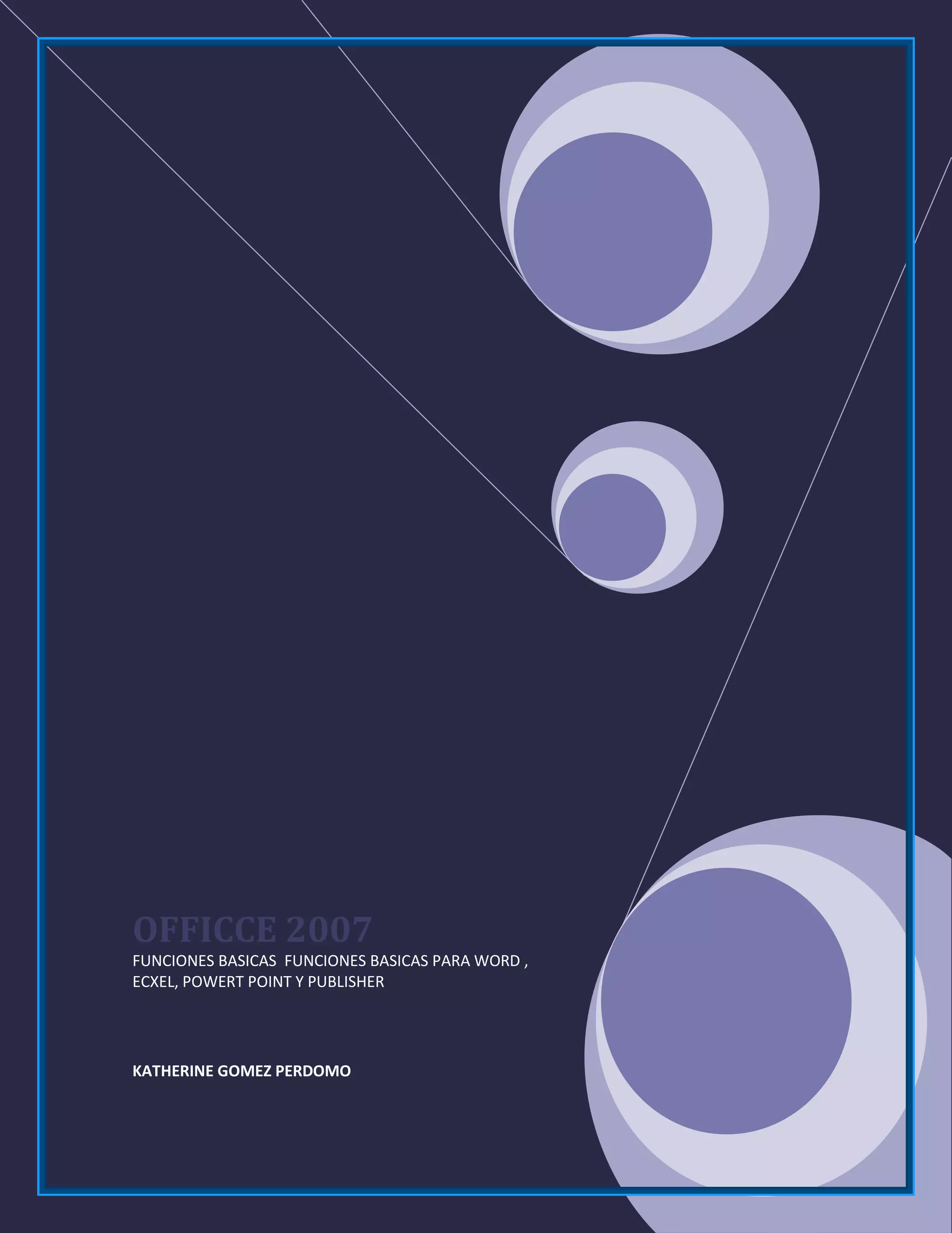 Este documento proporciona una guía sobre las funciones básicas de Microsoft Office 2007, incluyendo Word, Excel, PowerPoint y Publisher. Explica comandos útiles, extensiones y procedimientos para diseñar páginas en Word como marcas de agua, colores de fondo y bordes. También cubre cómo combinar correspondencia en Word usando el asistente de correspondencia en varios pasos.