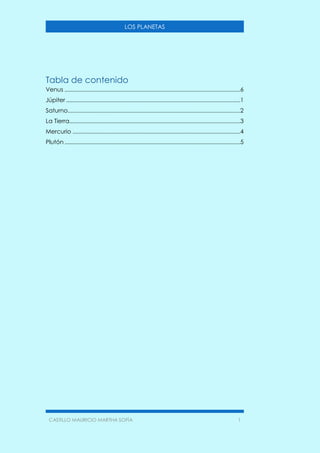 El documento proporciona información sobre los planetas del sistema solar, incluyendo Venus, Júpiter, Saturno, la Tierra, Mercurio y Plutón. Describe las características de cada planeta como su masa, distancia al sol y posibilidades de vida. También incluye gráficos e ilustraciones de los planetas. Además, ofrece consejos sobre cómo dar formato y diseño profesional a documentos en Word.