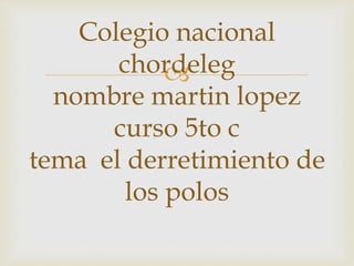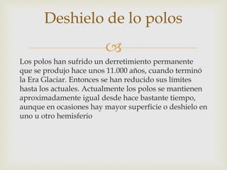 El documento describe el derretimiento de los polos como una amenaza grave para la humanidad. El deshielo ocurre debido al calentamiento global, el cual está causado por el aumento de gases de efecto invernadero como el dióxido de carbono producido por los combustibles fósiles. El deshielo polar está elevando el nivel del mar y poniendo en peligro países costeros. Para detener este problema, debemos crear conciencia social y erradicar las causas del calentamiento global.