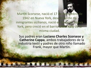 Este documento presenta un resumen biográfico de Martin Scorsese. Nació en Nueva York en 1942 de padres inmigrantes italianos y creció en el barrio de Little Italy. Estudió cine en la Universidad de Nueva York y dirigió varios cortometrajes antes de su primer largometraje en 1967. Algunas de sus películas más conocidas incluyen Taxi Driver, Toro Salvaje, Buenos Muchachos y Los Infiltrados. Scorsese es considerado uno de los directores más influyentes del cine est