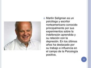 Martin Seligman es un psicólogo estadounidense conocido por sus experimentos sobre la indefensión aprendida y su relación con la depresión. En los últimos años ha destacado por su trabajo en el campo de la psicología positiva, fundando este movimiento que estudia las emociones placenteras, las virtudes y la felicidad. Actualmente dirige el Departamento de Psicología de la Universidad de Pensilvania y promueve el estudio del bienestar más allá de solo enfocarse en las emociones negativas.