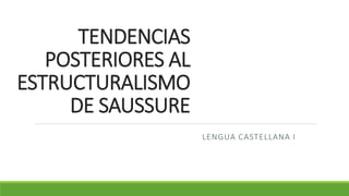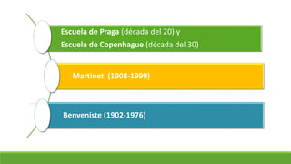 Este documento resume las principales corrientes lingüísticas posteriores al estructuralismo de Saussure, incluyendo la Escuela de Praga, la Escuela de Copenhague, los trabajos de André Martinet y Émile Benveniste. Martinet define el lenguaje como una institución humana y un instrumento de comunicación con una doble articulación en monemas y fonemas. Benveniste propone estudiar la enunciación más que el signo, enfocándose en la subjetividad del lenguaje. Finalmente, se menciona brevemente la