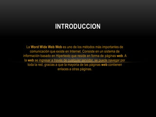 La Web es un sistema de información basado en hipertexto que reside en páginas web accesibles a través de servidores. Ha evolucionado desde su invención, pasando de ser una forma de solo informar (Web 1.0) a permitir la comunicación bidireccional y redes sociales (Web 2.0) gracias a nuevas herramientas como comentarios, chats y blogs. A medida que avanza la tecnología, la Web también ha tenido cambios considerables en su contenido y forma de generar páginas estáticas o dinámicas.