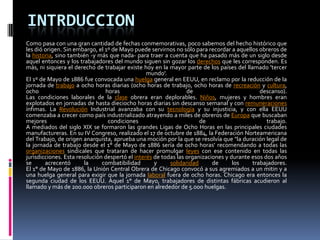El documento habla sobre el Día de los Trabajadores y su origen en la huelga general del 1 de mayo de 1886 en Estados Unidos para exigir la jornada laboral de 8 horas. Más de 200,000 trabajadores participaron en huelgas ese día. En Chicago la policía disparó contra manifestantes, matando a 6 personas e hiriendo a decenas. Este hecho llevó a que el 1 de mayo sea conocido como el Día Internacional de los Trabajadores en memoria de las luchas obreras por mejores condiciones laborales.