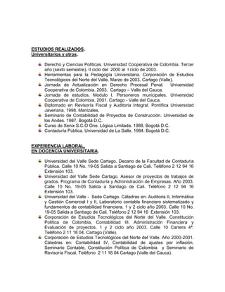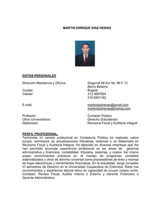 Este documento presenta el perfil profesional y la experiencia laboral de Martín Enrique Díaz Henao. Detalla su formación académica que incluye títulos en Contaduría Pública, Derecho y un diplomado en Revisoría Fiscal. Describe su experiencia como docente universitario, contador externo y revisor fiscal en diversas empresas públicas y privadas en los sectores de construcción, comercio, servicios y agroindustria. Finalmente, incluye tres referencias personales.