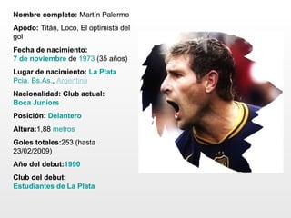 Nombre completo: Martín Palermo Apodo: Titán, Loco, El optimista del gol Fecha de nacimiento: 7 de noviembre de 1973 (35 años) Lugar de nacimiento: La Plata Pcia. Bs.As. , Argentina Nacionalidad: Club actual: Boca Juniors Posición: Delantero Altura: 1,88 metros Goles totales: 253 (hasta 23/02/2009) Año del debut: 1990 Club del debut: Estudiantes de La Plata Nombre completo: Martín Palermo Apodo: Titán, Loco, El optimista del gol Fecha de nacimiento: 7 de noviembre de 1973 (35 años) Lugar de nacimiento: La Plata Pcia. Bs.As. , Argentina Nacionalidad: Club actual: Boca Juniors Posición: Delantero Altura: 1,88 metros Goles totales: 253 (hasta 23/02/2009) Año del debut: 1990 Club del debut: Estudiantes de La Plata