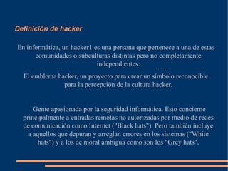 El documento presenta información sobre varias mujeres hackers notables. Incluye breves biografías de Lisbeth Salander, una personaje de ficción creada por Stieg Larsson; Grace Hooper, una pionera en informática y programación; y Jude Milhon, también conocida como St. Jude, una defensora de los derechos cibernéticos y creadora del movimiento ciberpunk.