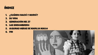 Maruja Mallo nació en 1902 en Galicia y murió en 1995 en Madrid. Fue una pintora surrealista española que formó parte de la Generación del 27. Algunas de sus obras más conocidas incluyen "La sorpresa del trigo", "El espantapájaros" y "Canto de las espigas".