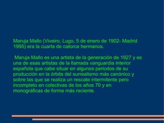 Maruja Mallo fue una artista española de la Generación del 27. Nació en 1902 y se formó en Asturias y Madrid, exponiendo su obra en España y el extranjero desde los años 20. Su estilo inicial se encuadraba en la Nueva Objetividad, pero luego se acercó al surrealismo. Debido a la Guerra Civil, Mallo pasó 25 años en el exilio en Buenos Aires, donde desarrolló nuevas series pictóricas influenciadas por América antes de regresar a España en 1964. Maruja Mallo falleci
