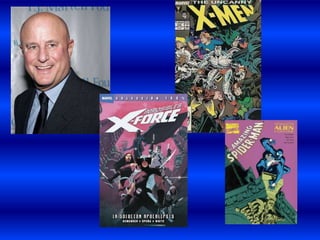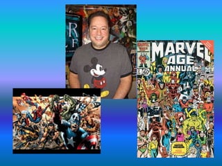 El documento resume la historia de Marvel Comics desde 1939 hasta la década de 1970. Comenzó como Timely Publications bajo la dirección de Martin Goodman antes de convertirse en Atlas Comics y luego en Marvel Comics. Personajes clásicos como Spiderman, Hulk, Iron Man y los X-Men fueron creados por artistas como Stan Lee, Jack Kirby y Steve Ditko en la década de 1960, llevando al éxito a Marvel Comics.