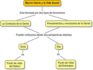 Este documento presenta resúmenes biográficos de dos antropólogos importantes: Marvin Harris, fundador del materialismo cultural que buscaba explicaciones científicas de las diferencias culturales; y Max Gluckman, fundador de la Escuela de Manchester que estudió el conflicto social y sus mecanismos de negociación desde un enfoque científico. También define brevemente el materialismo cultural y la teoría del conflicto de Gluckman.