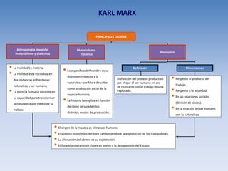 El documento resume las principales ideas de Karl Marx sobre el materialismo histórico. Explica que la realidad está compuesta por la naturaleza y los seres humanos, y que la historia se explica por los diferentes modos de producción. Define la estructura económica como compuesta por las fuerzas productivas y las relaciones de producción, y la superestructura como las instituciones sociales. Finalmente, resume los diferentes modos de producción históricos.