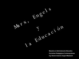 El documento resume las ideas de Marx y Engels sobre la educación. Sostienen que la educación debe ser pública y gratuita para todos los niños, abolir el trabajo infantil en fábricas, y relacionar la educación con el trabajo productivo. Engels propuso que todos los niños deben recibir educación estatal desde una edad temprana. El objetivo final de la educación según Marx es lograr la "polivalencia" y "movilidad absoluta del trabajador".