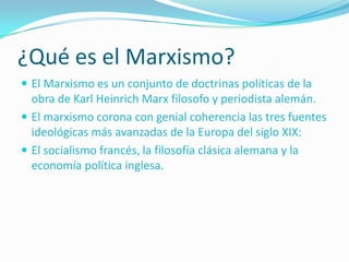 El documento resume los principales conceptos del marxismo. Explica que el marxismo se basa en el materialismo histórico de Marx y Engels y que analiza la historia y la sociedad en términos de la lucha de clases entre el proletariado y la burguesía. También describe los conceptos clave de plusvalía, explotación, alienación y las contradicciones internas del capitalismo que eventualmente conducirán a su colapso y serán reemplazadas por el socialismo.