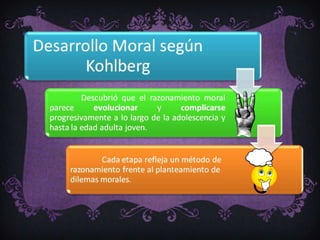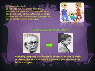 El documento describe las teorías del desarrollo moral de Piaget y Kohlberg. Ambos creían que la moral se desarrolla en etapas cognitivas y emocionales. Piaget propuso tres etapas: pre-moral, heterónoma y autónoma. Kohlberg propuso seis etapas en tres niveles: moral convencional y postconvencional. El desarrollo moral permite tomar decisiones autónomas y preocuparse más por los demás.